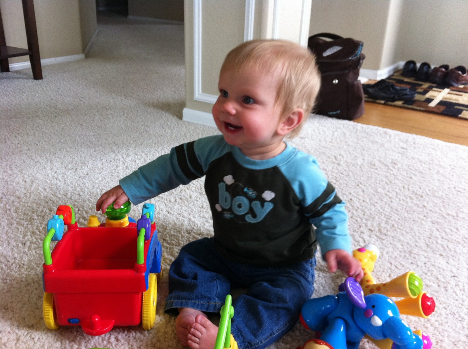 And within a day, he was back at it! Here he is enjoying playing with Aspen's toys at her first birthday party: